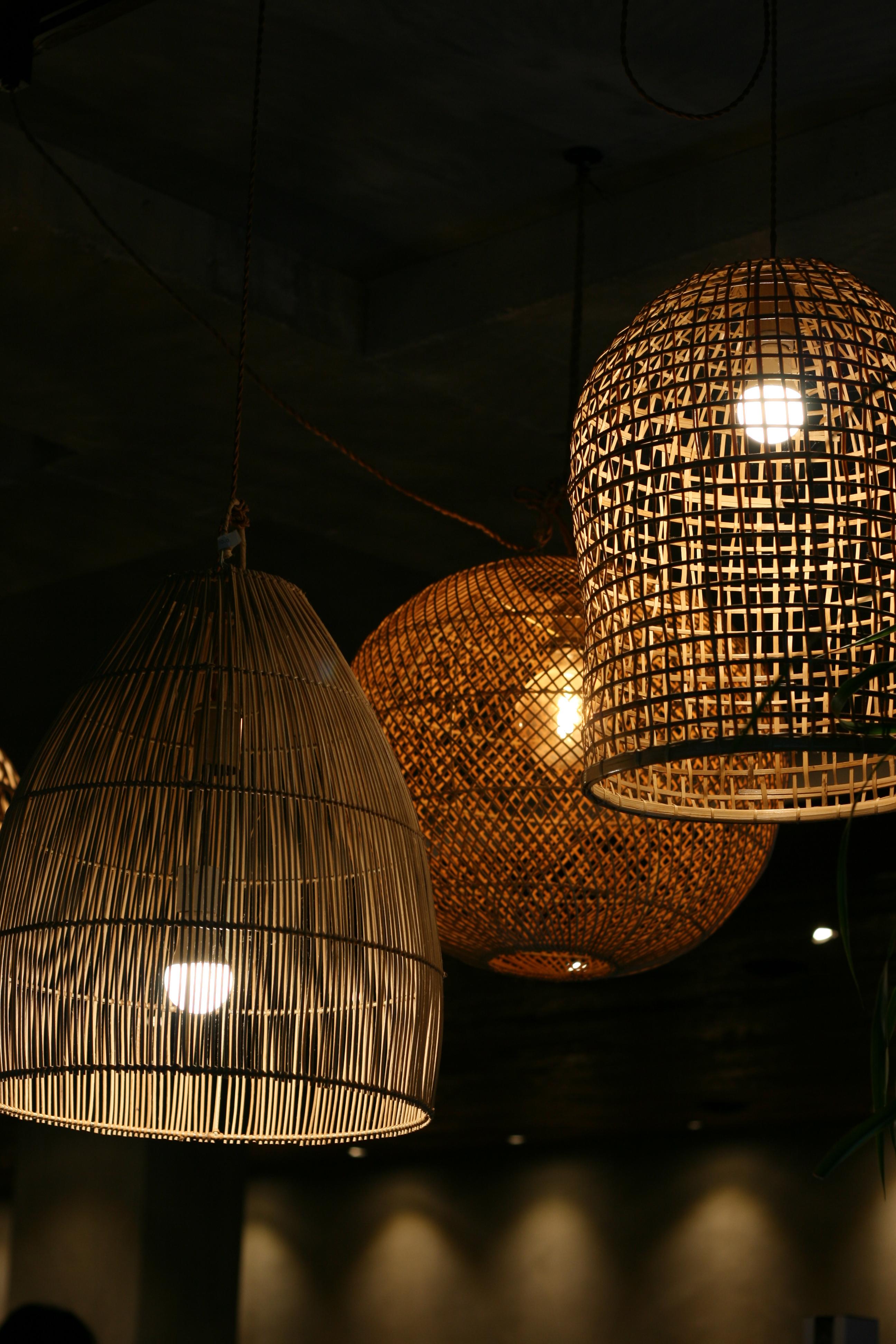 천장에서 내려오는 대나무 소재의 램프들은 자연스럽고 아늑한 분위기를 자아냅니다. 벽면은 콘크리트 톤으로 마감되어 세련된 감성과 따뜻함이 공존해요.