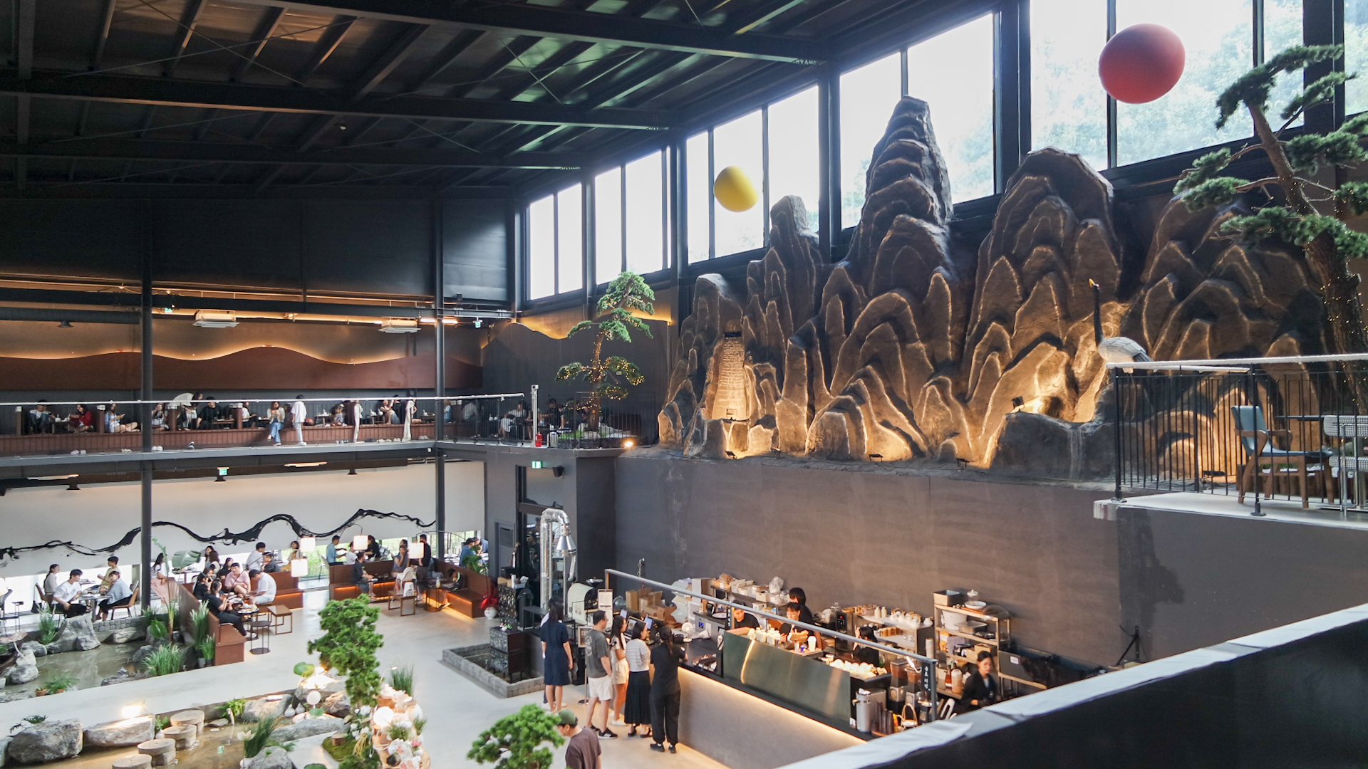 천장이 높게 뚫려 있어 시원한 개방감을 주었고, 한쪽 벽면에는 거대한 바위산 모양의 구조물이 자리 잡고 있었다. 은은한 조명이 바위를 따라 흘러내리듯 비추고 있었는데, 마치 어느 산 속에 들어와 있는 듯한 착각을 불러일으켰다. 사람들의 대화 소리와 잔잔한 음악이 뒤섞여 공간 전체가 하나의 작품처럼 느껴졌다.