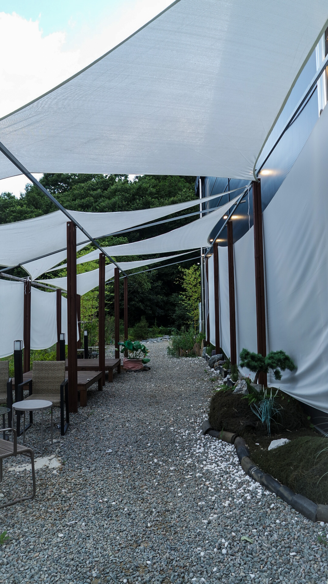 하얀 천으로 가볍게 그늘을 드리운 길, 그 아래로 자갈이 깔려 있어 걸음을 옮길 때마다 바스락 소리가 났다. 곳곳에는 작은 의자와 테이블이 놓여 있어 잠시 앉아 바람을 맞으며 차를 즐기기 좋았다. 여름의 햇볕은 따갑지만, 하얀 그늘막 아래에서 느껴지는 시원한 바람은 그 모든 걸 잊게 했다.